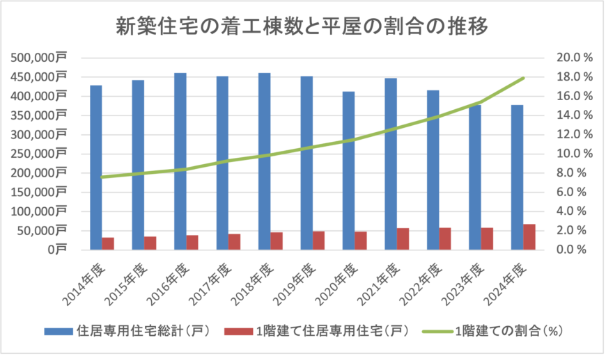 国土交通省の「建築着工統計調査」によると、2024年度に着工された居住専用住宅377,236棟のうち、平屋(1階建て)は67,628棟で、全体の約18%を占めます。同調査では、新築住宅全体の着工数が減少するなかで、平屋の着工数は増加傾向にあり、全体に占める割合も、10年前の7%程度から右肩上がりに増えていることが明らかになっています。