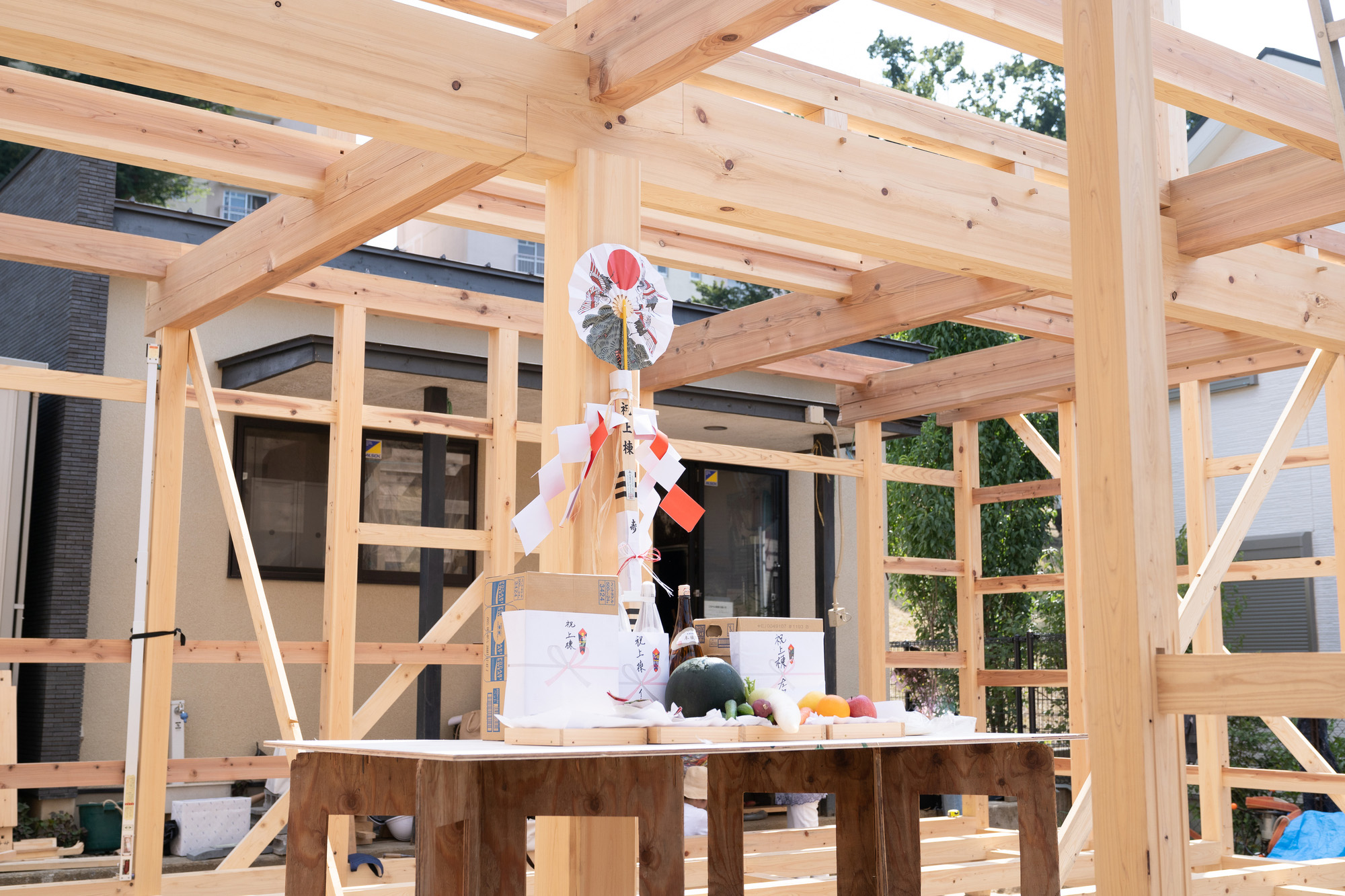上棟式は建物の骨組みが完成し、棟木を上げるタイミングに合わせて実施するのが一般的です。