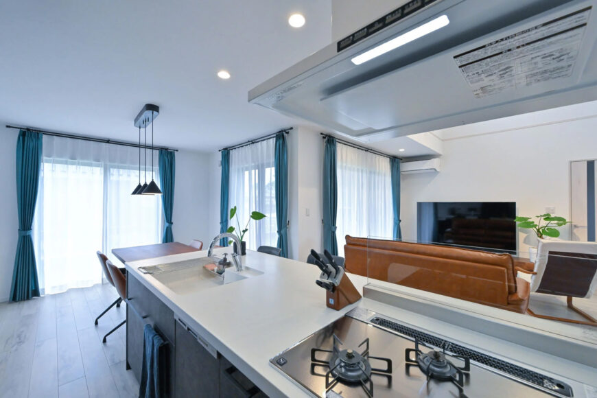 こちらの4LDKの平屋住宅は、開放的な対面キッチンを採用。料理や洗い物の最中でも、常に家族の気配を感じられる温かい空間となっています。