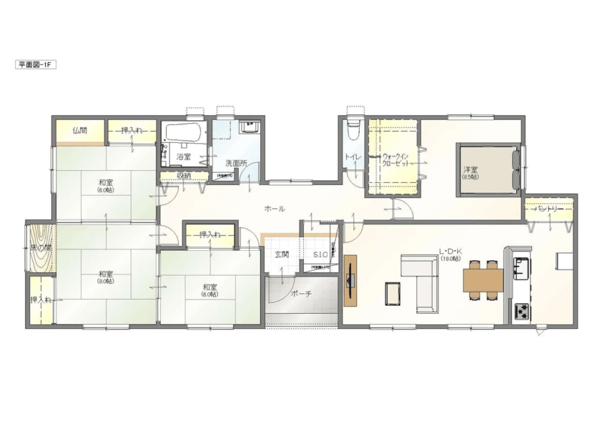 日本古来の床の間や仏間を残しつつ、パントリーやシューズインクローゼット(SIC)など近年人気の設備も備えた、温故知新の住まいです。