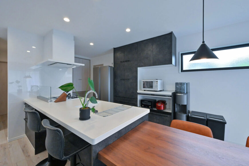 また、キッチンのペンダントライトの色・形をLDKのダウンライトと合わせているのもポイントです。空間に一体感が生まれ、おしゃれで広々とした印象を与えています。