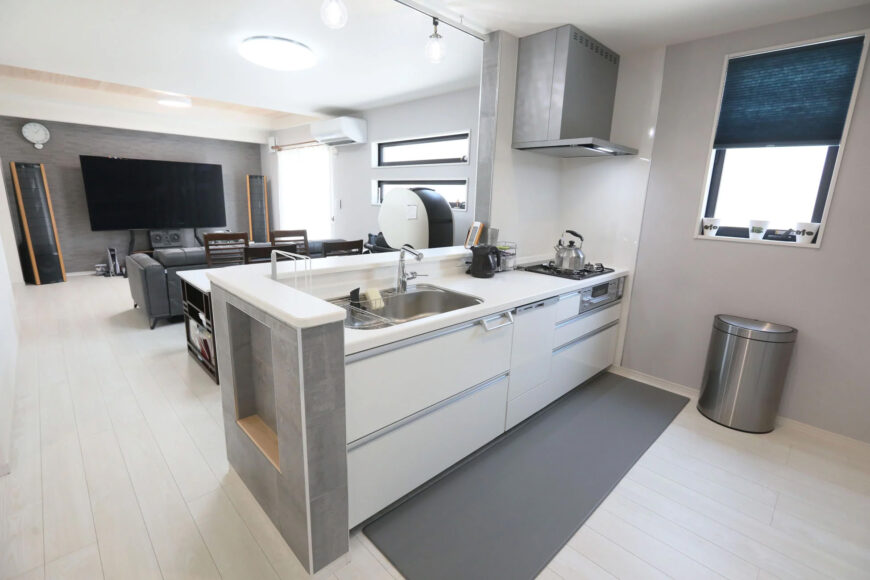 こちらのキッチンは、グレーと白を基調としたデザインがモダンな内装にマッチしています。