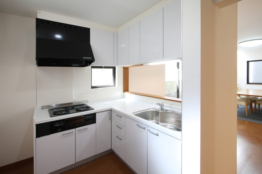 L型キッチンは、内部のスペースが確保できるため複数人での作業がしやすいのが特徴です。また、Ⅱ型キッチンと同様キャビネット数を確保しやすいため収納力にも優れています。
