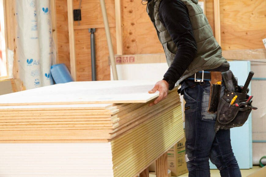 上棟後におこなう木工事では、床や壁、天井の下地を組みます。断熱材の施工や窓枠、階段の取り付けも、木工事に含まれます。
