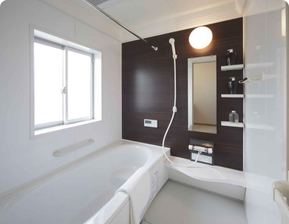 バリアフリー設計のバスルームは、親子入浴に最適な浴槽内ステップ付きで安心してご入浴いただけます。ドアはパッキンをなくし、床は乾燥が速いのでカビの発生を抑えます。