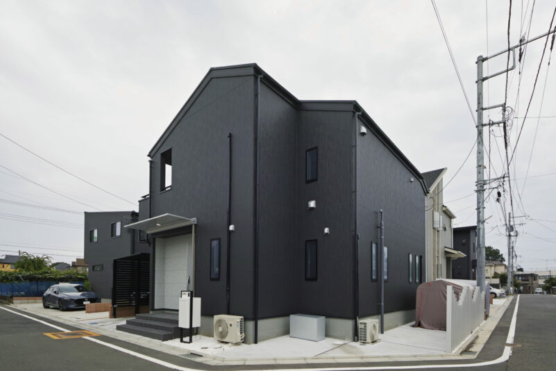 玄関ポーチの屋根はステン色の後付け庇を設置し、外壁もメインのブラックのサイディングを縦張りにすることでよりスタイリッシュな外観となっております。