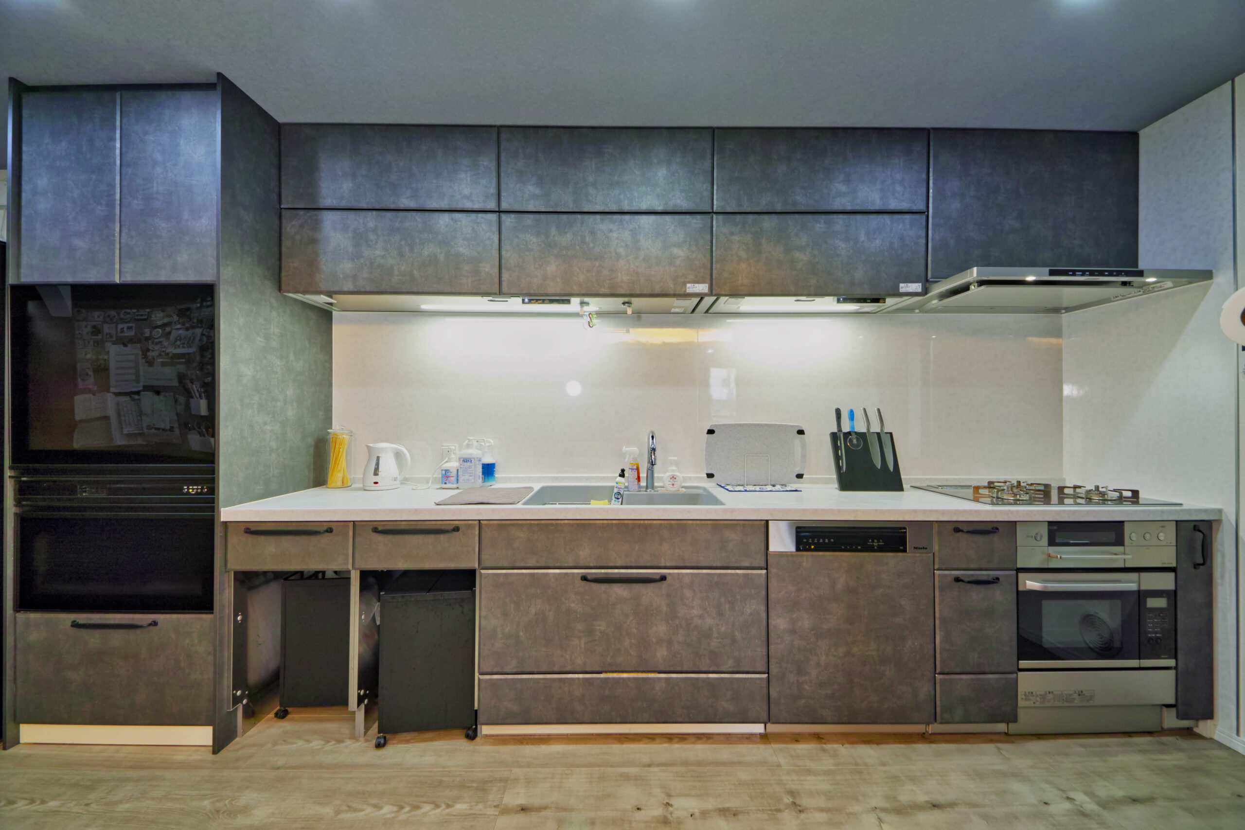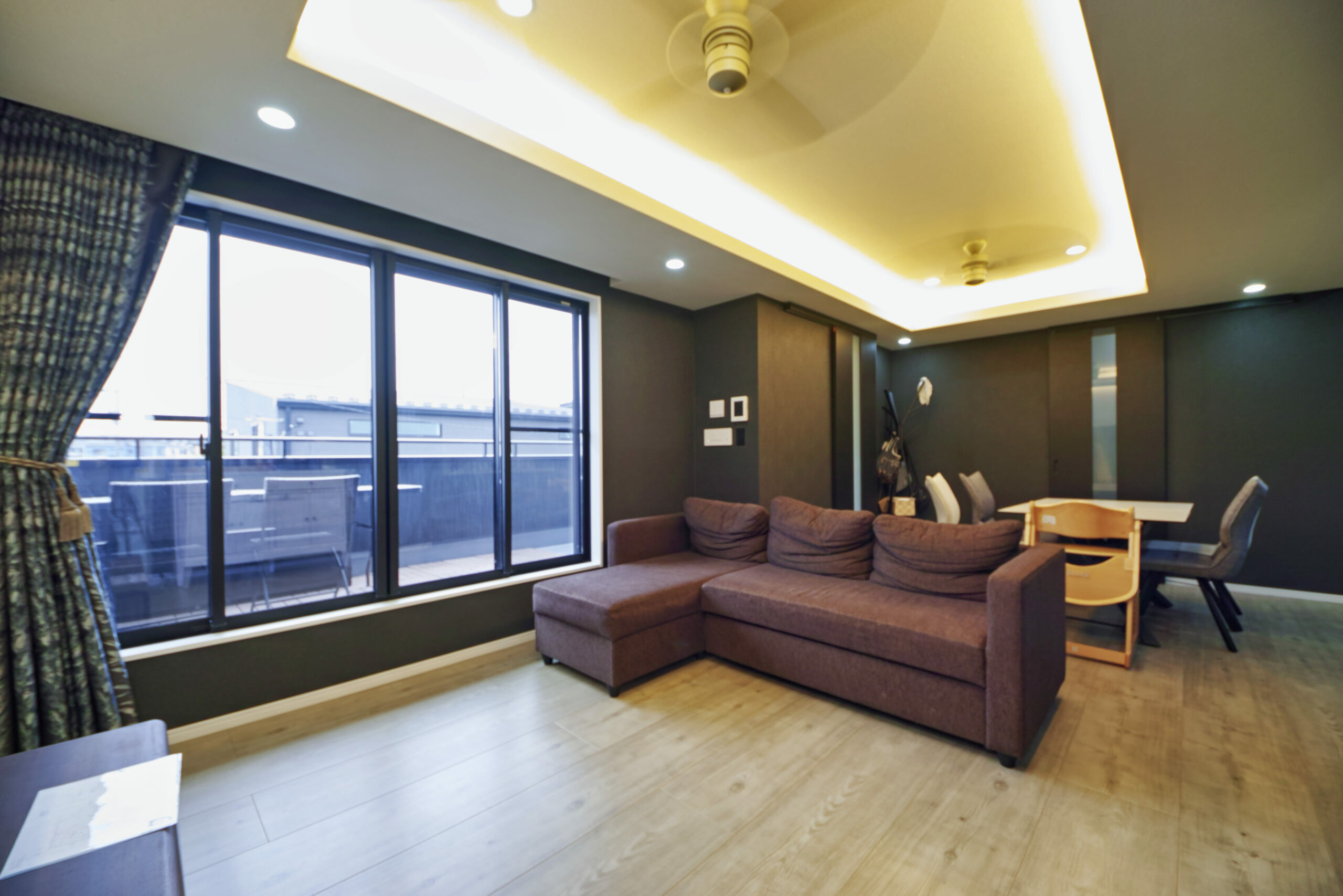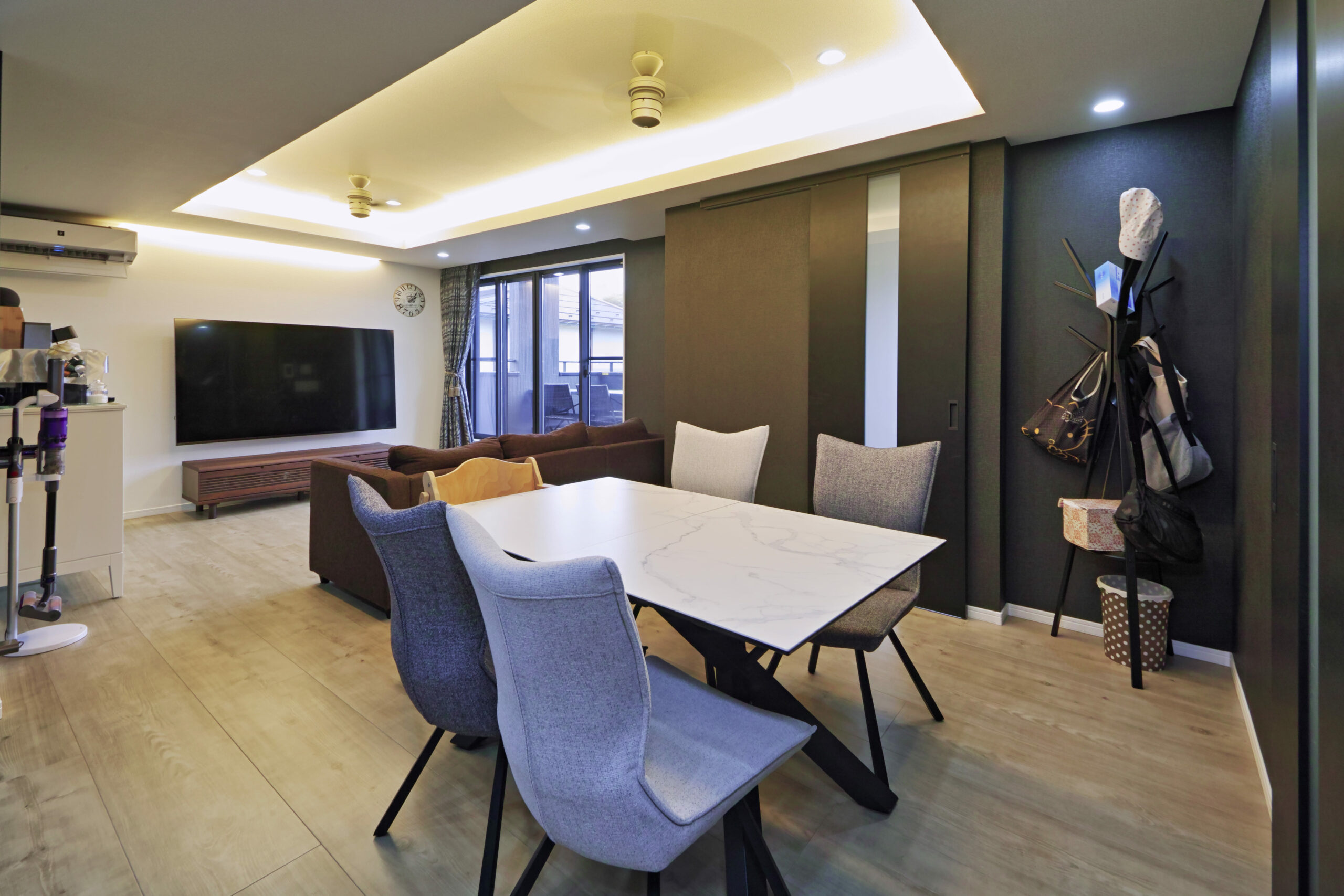 2階リビングに折り下げ天井+間接照明があり、クロスや内装ドアのお色もお客様のご希望でグレーやブラックでまとめられていることでまさにホテルライクなお家になっています。