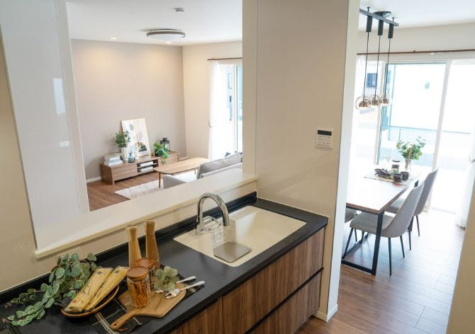 キッチンからリビングに視線が通るから安心。