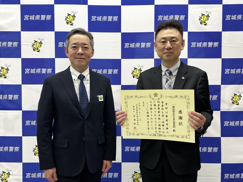 飯田グループホールディングスの中核企業である一建設株式会社(本社:東京都豊島区、代表取締役:堀口 忠美、以下、一建設)は、2026年1月23日(金)に宮城県における刑事警察活動に積極的に協力したことが評価され、宮城県警察本部(以下、宮城県警)より感謝状を授与されました。